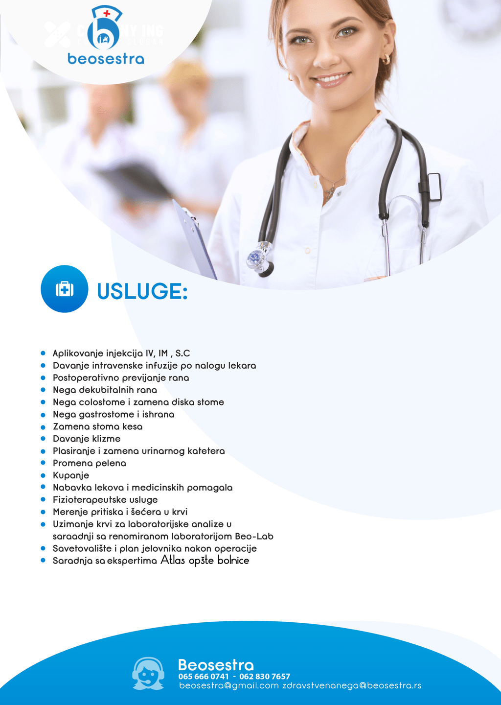 After several years of experience in surgery and medical clinical care, cooperation with experts from all medical fields, there was a need for medical care in home conditions.  This resulted in cooperation between Atlas General Hospital and “Beosestra” service. Atlas General Hospital experts will be available to the patients that use “Beosestra” services from now on in home as well as consultative examinations.