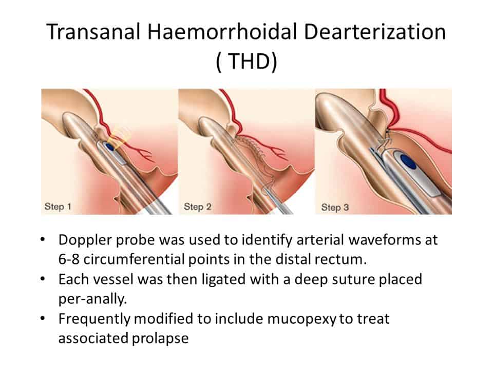 After the examination and diagnosis of hemorrhoids, and preparation for THD method operation, the intervention is performed. There is special designed anoscope with cold light and implanted  doppler probe that is connected with the THD apparatus. Using doppler, surgeon searches for hemorrhoid artery that fills the shunt and locates it. One detected with special system of guides, artery is detected and on the entrance to the shunt is tied and thus etiologically problem is solved.  6 arteries are those that should be found. When surgeon closes all shunts, problem is solved, usually for good.
