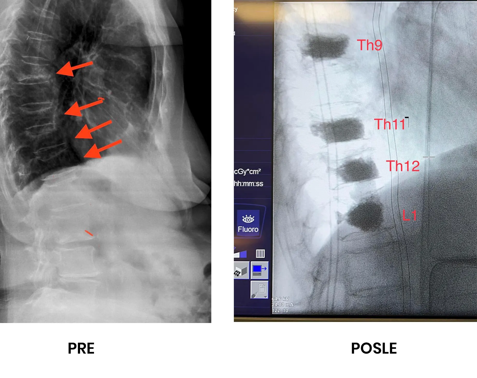 Pacijentkinja od 83 godine, sa naglo nastalim nepodnošljivim bolom u leđima. Ima dokazanu osteoporozu. MR i RTG kičme pokazao je postojanje kompresivnih preloma četiri pršljena, zbog generalizovanja osteoporoze.